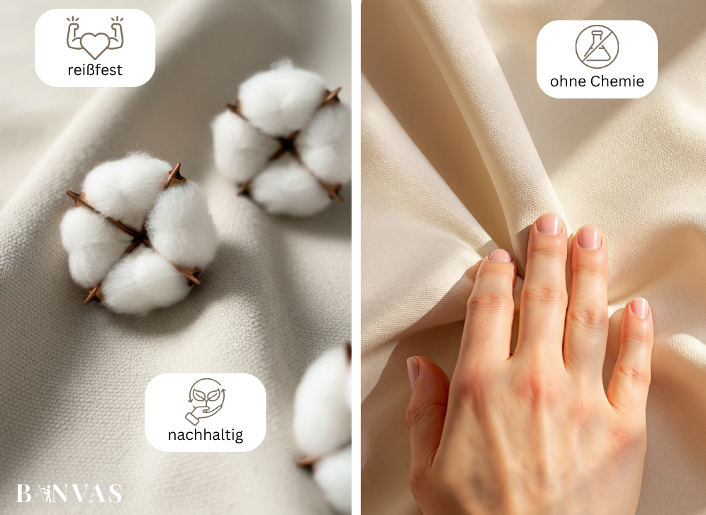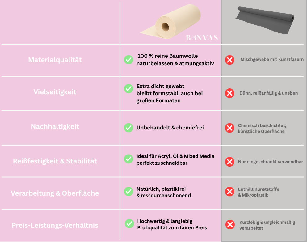 Sieh auf einen Blick, warum unser naturbelassener Baumwollstoff die bessere Wahl ist: höhere Qualität, mehr Stabilität und ein spürbar professionelleres Ergebnis bei all deinen Leinwandprojekten.