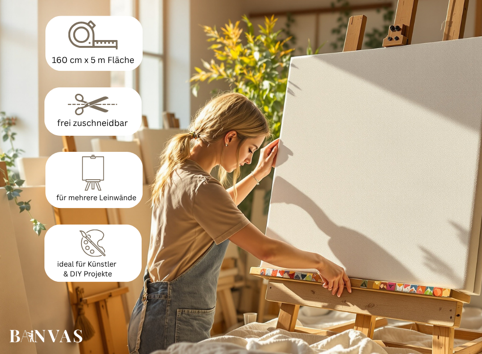 Perfekt für Künstler und Hobbykreative: Der stabile Baumwollstoff eignet sich für jede Leinwandgröße, lässt sich leicht spannen und bietet eine zuverlässige Grundlage für Acryl-, Öl- und Mixed-Media-Techniken.